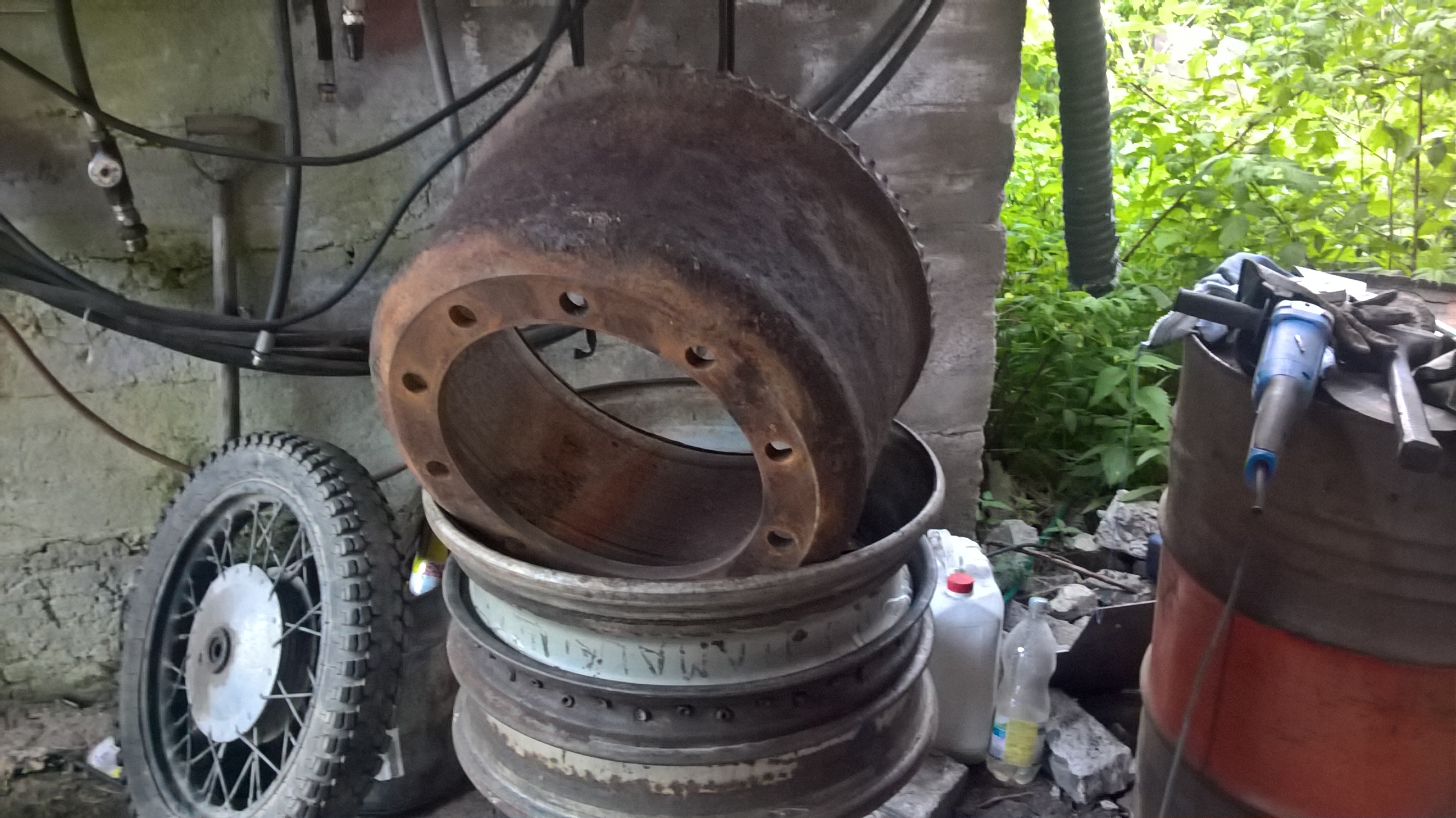 Pyyhkäsin tommosen oikaisu/pinnausjigin vanhasta kuorma-auton peräkärryn 19,5" vanteesta (jarrurumpu oli toinen vaihtoehto). Se sattuu niin hyvin mitoilleen, kun vetää sen poikki sopivasta kohdasta. Ei tarvi sorvissa ottaa kuin muutama oikaisulastu. Se on senverran rankkaa tekoa, että kärsii prässäystä ja vasaran paukuttelua. Kyllä tuo kokeiluvanne (pinnat löysällä) pyöristyi melkoisesti prässäyksen ja paukuttelun ansiosta.Milleissä.