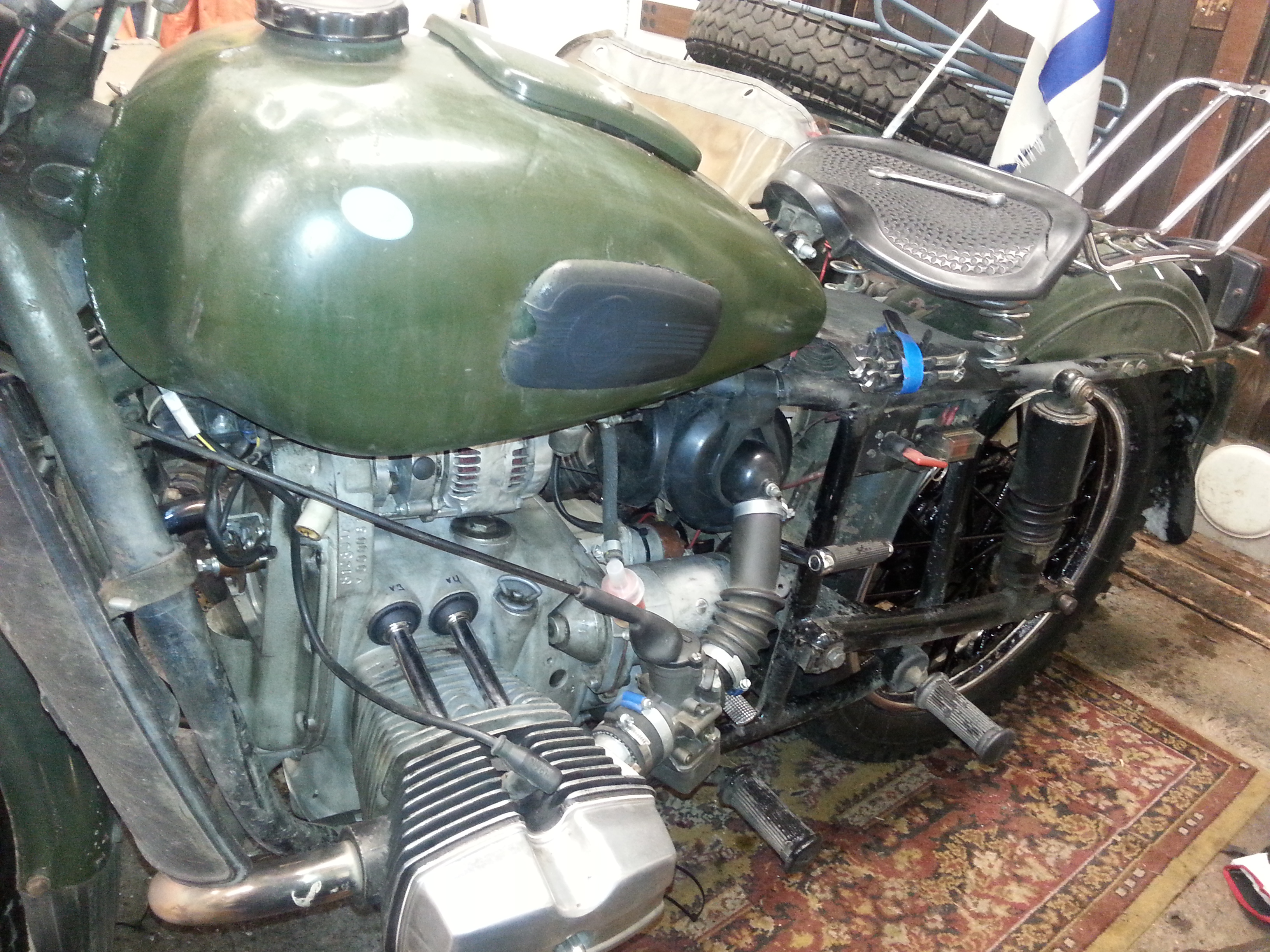 Eipähän tuota ole kovinkaan paljon raportoitavaa noista aikaansaannoksista, kun on muutama viikko mennyt sovitellessa tätä jalkaisin liikkumista, tuon uuden nivelen kanssa, mutta kyllä se alkaa sujua. Syksy on mennyt Erkkilän Lassen kanssa yhden Mersun pakun ja yhden Fiat 127. parsimisessa ja niitä riittää vielä. Nyt kun ei oikein ole raskainpiin toimiin päässyt on tässä toipilasaikana rakennellut Uraliin levyjarrua eteen, Rampen lahjoittamista palikoista ja se on reaktiotangon passausta vaille valmis. Karpin toiveesta pitää kuitenkin maalata sivuvaunua ja lokasuojia samaan väriin kun tankki ja sivuvaunun keula on, jote ne on purettu ja odottelevat toimenpiteitä. Vessin tekemä uusi pyörä 8 mm:n pinnoilla on tänään eka kertaa maalattu ja