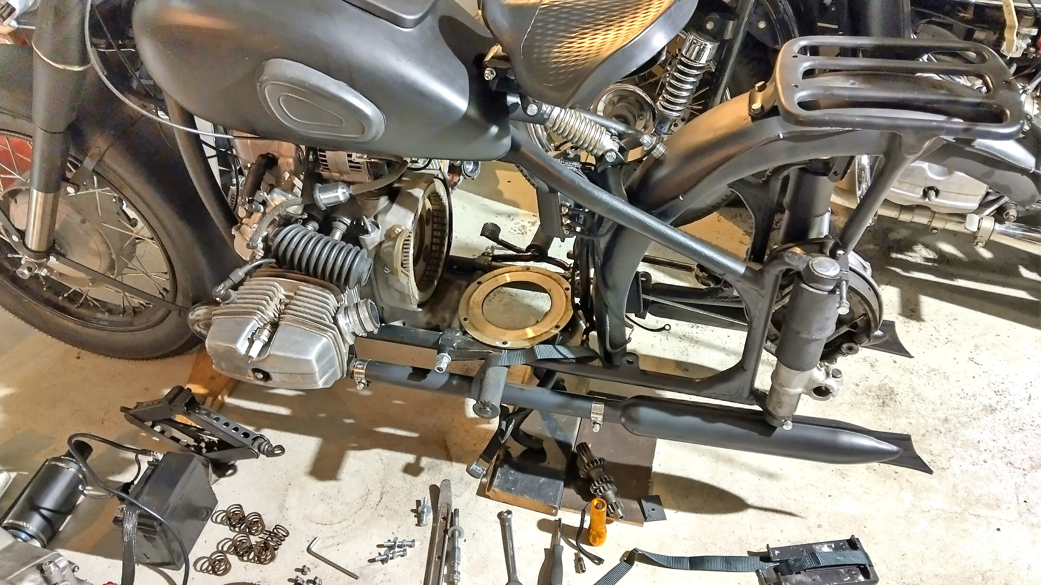 Eli edessä on siis: satulan irrotus, tankin irrotus, moottorin ylätuen irrotus, pakokäyrien irroitus, moottorin alapulttien irrotus, moottorin siirtäminen niin eteen kuin menee, kumilimppu pois, vaihdelaatikon irrotus ja pöydälle. Ja sitten sama uudestaan käänteisessä järjestyksessä kun stefa on saatu vaihdettua.