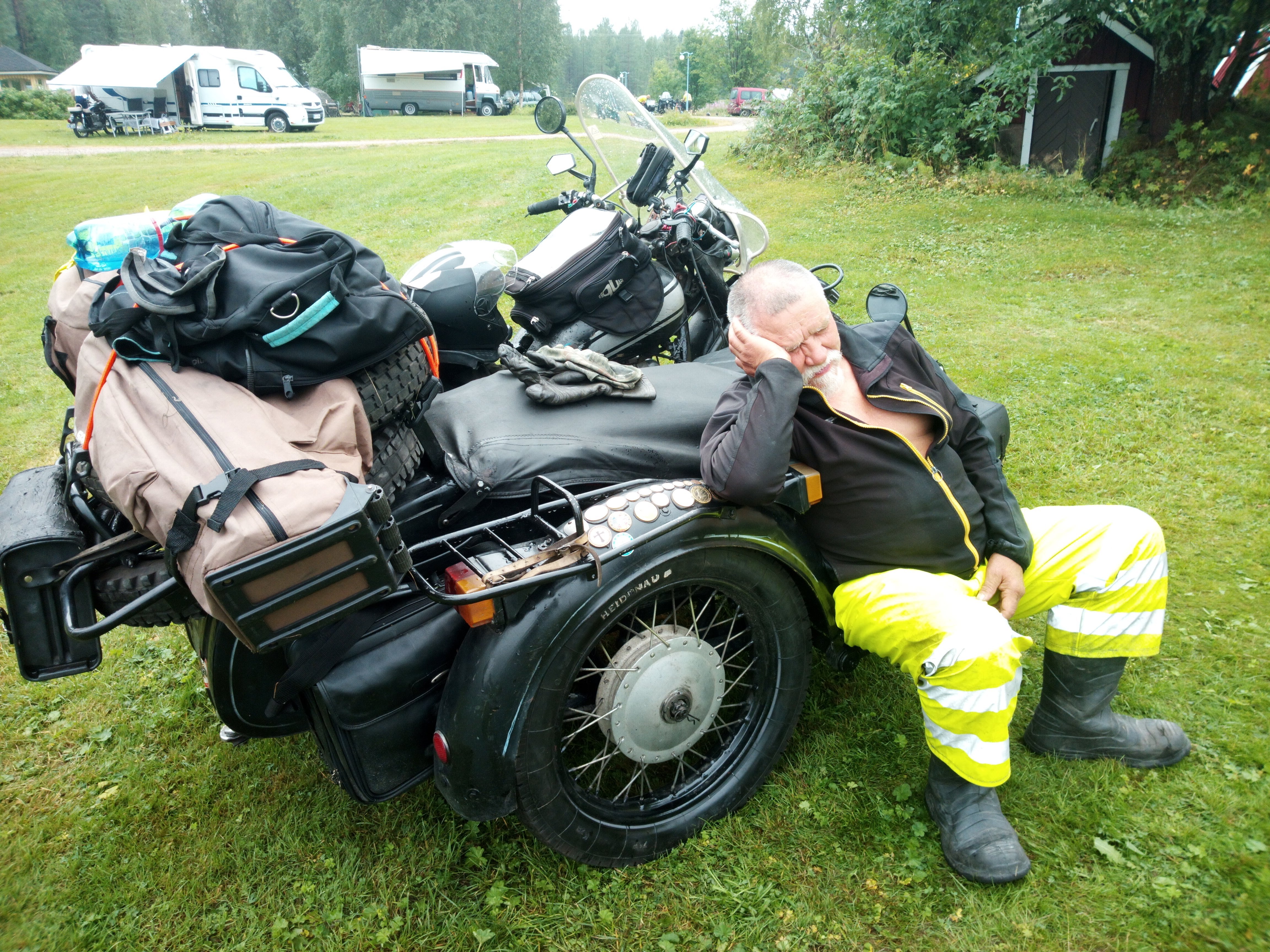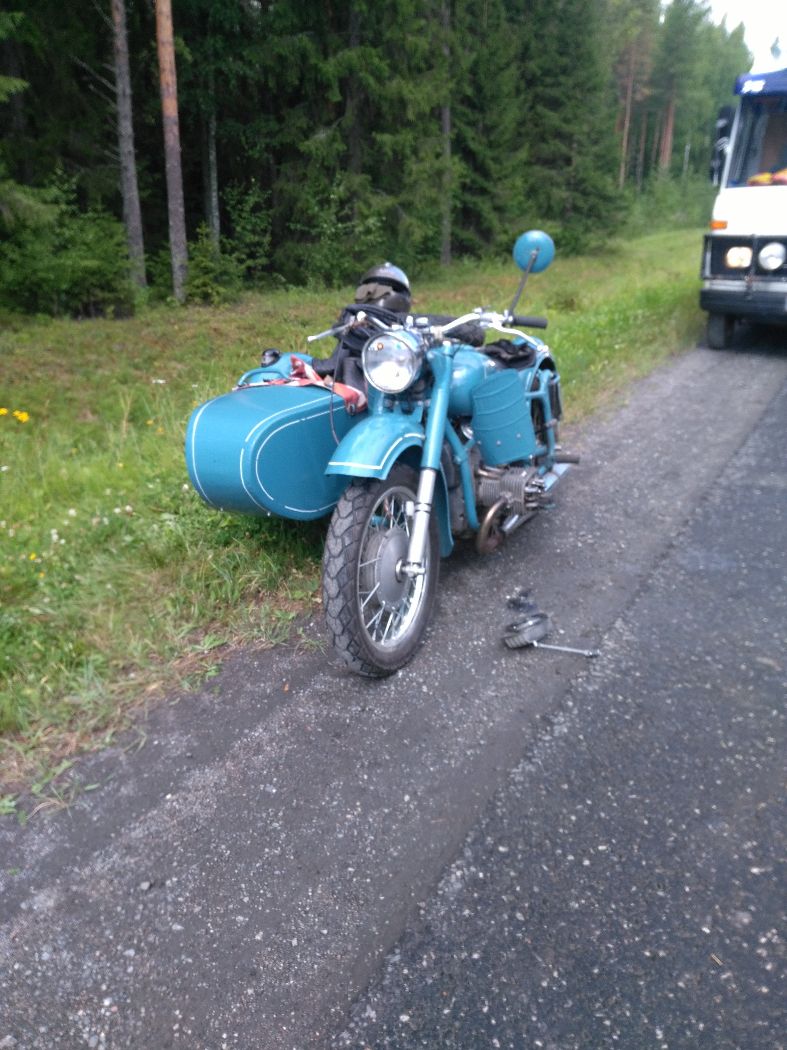 Siitä matkamme jatkui todella kaameassa kaatosateessa ja suuntana etelä Murmansk-Pietari tietä aina Prääsaan saakka josta käännyimme kohti Sortavalaa ja kaikki näytti oikein hyvältä. Mutta, sitten n. 70 km ennen Sortavalaa Ismolta puhkesi taka-rengas, jota kyllä osasimme odottaakin, sillä siinä oli kilometrit täynnä jo kotoa lähtiessä näin meikäläisen silmin. Se vaihdettiin ja jatkoimme matkaa, seuraava pysähdys, kun "seiskapätkä"(Karpin käyttämä nimi 750 cc moottorista), alkoi puhallella savua huohottimen kautta, katsottiin öljyt ja lisättiin