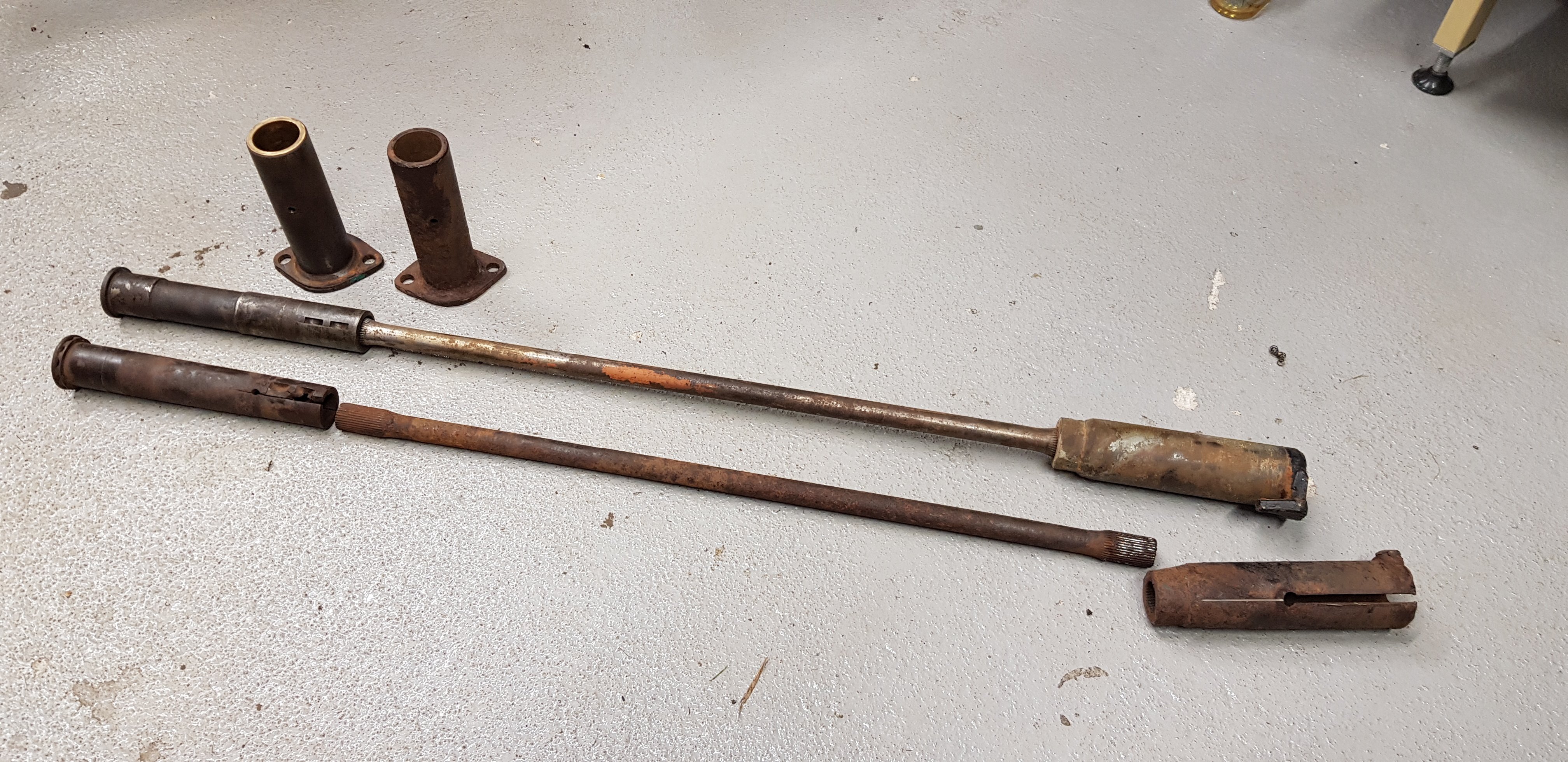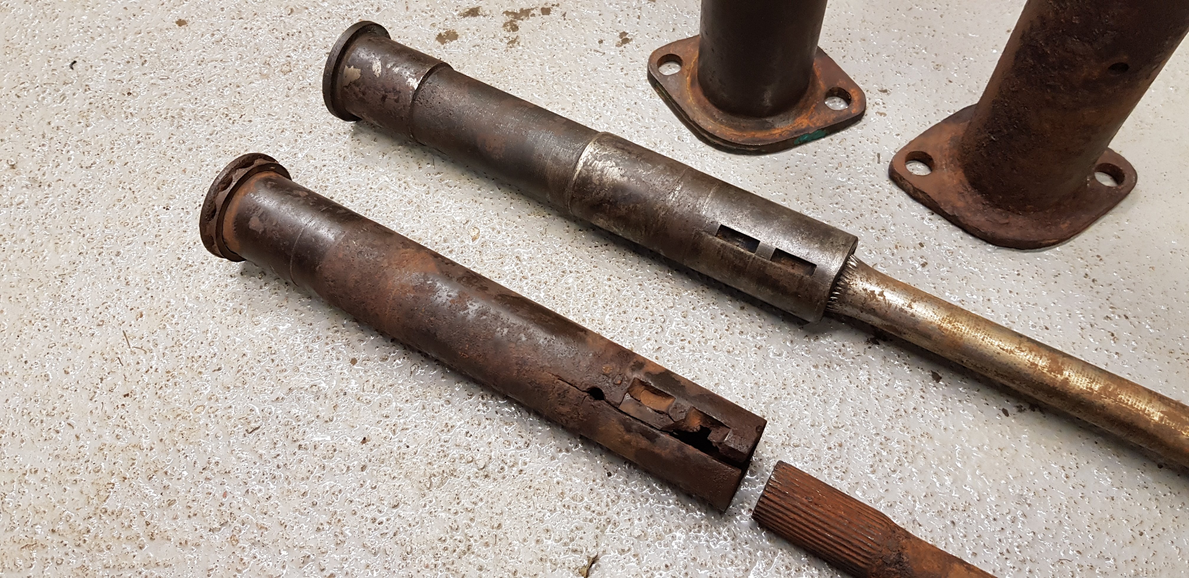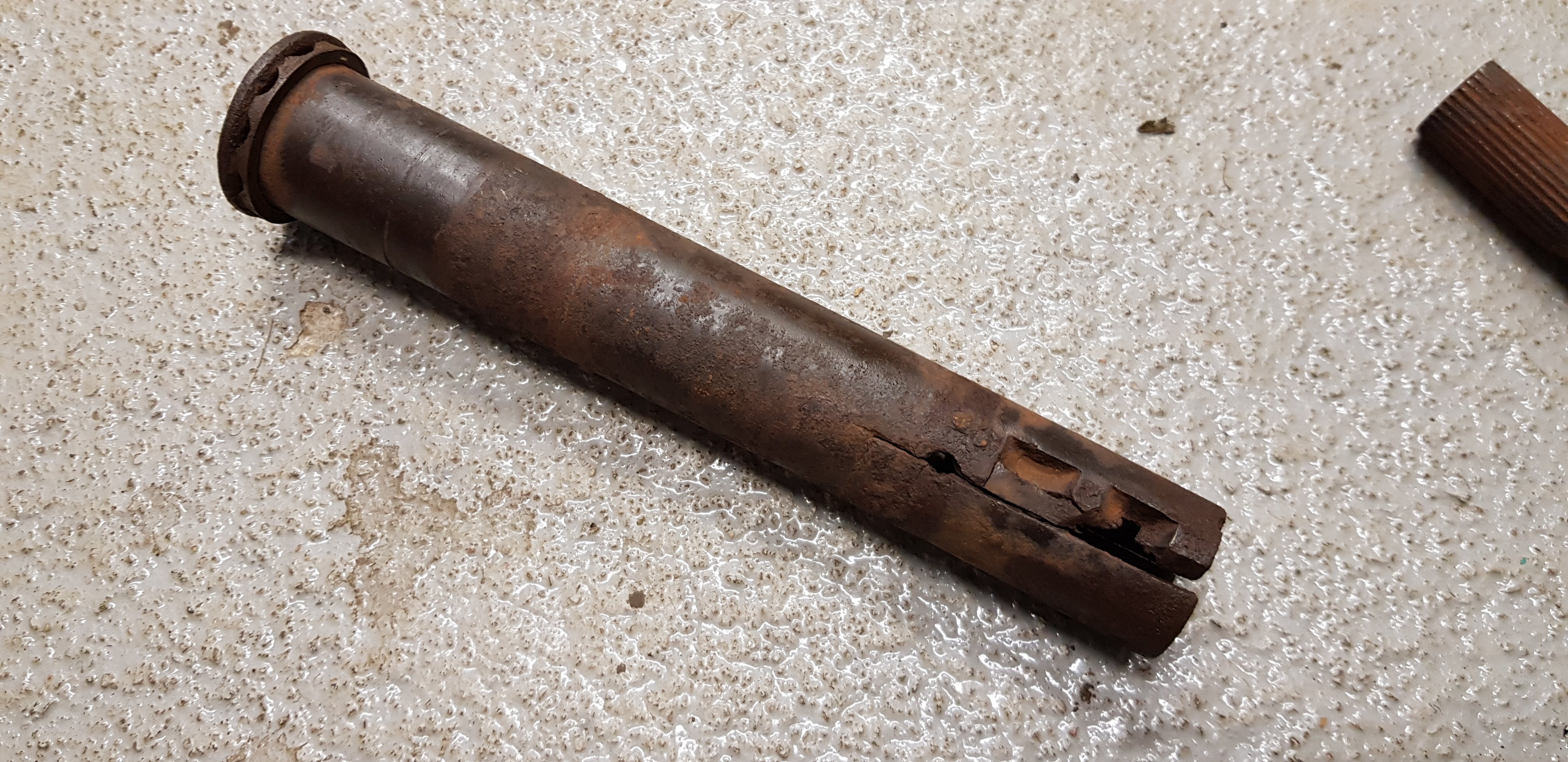 Lähempää kuva osasta, joka enimmäkseen päältä kuluu soikeaksi ja aikaisemmissa kuvissa putki puslineet, jossa korvakot putkessa n.200mm pitkän putken sisässä kaksi puslaa jotka kuluu myös soikeaksi