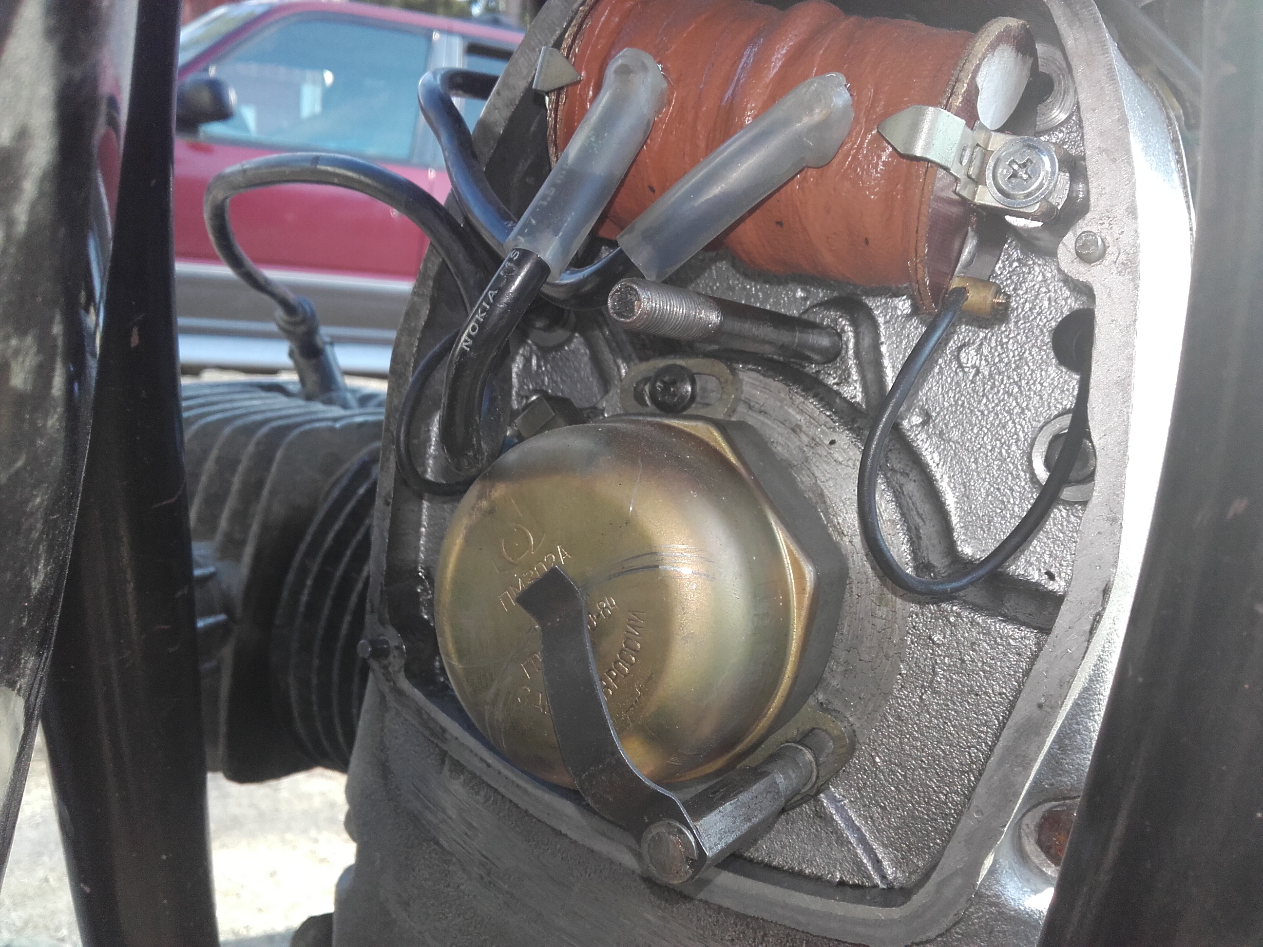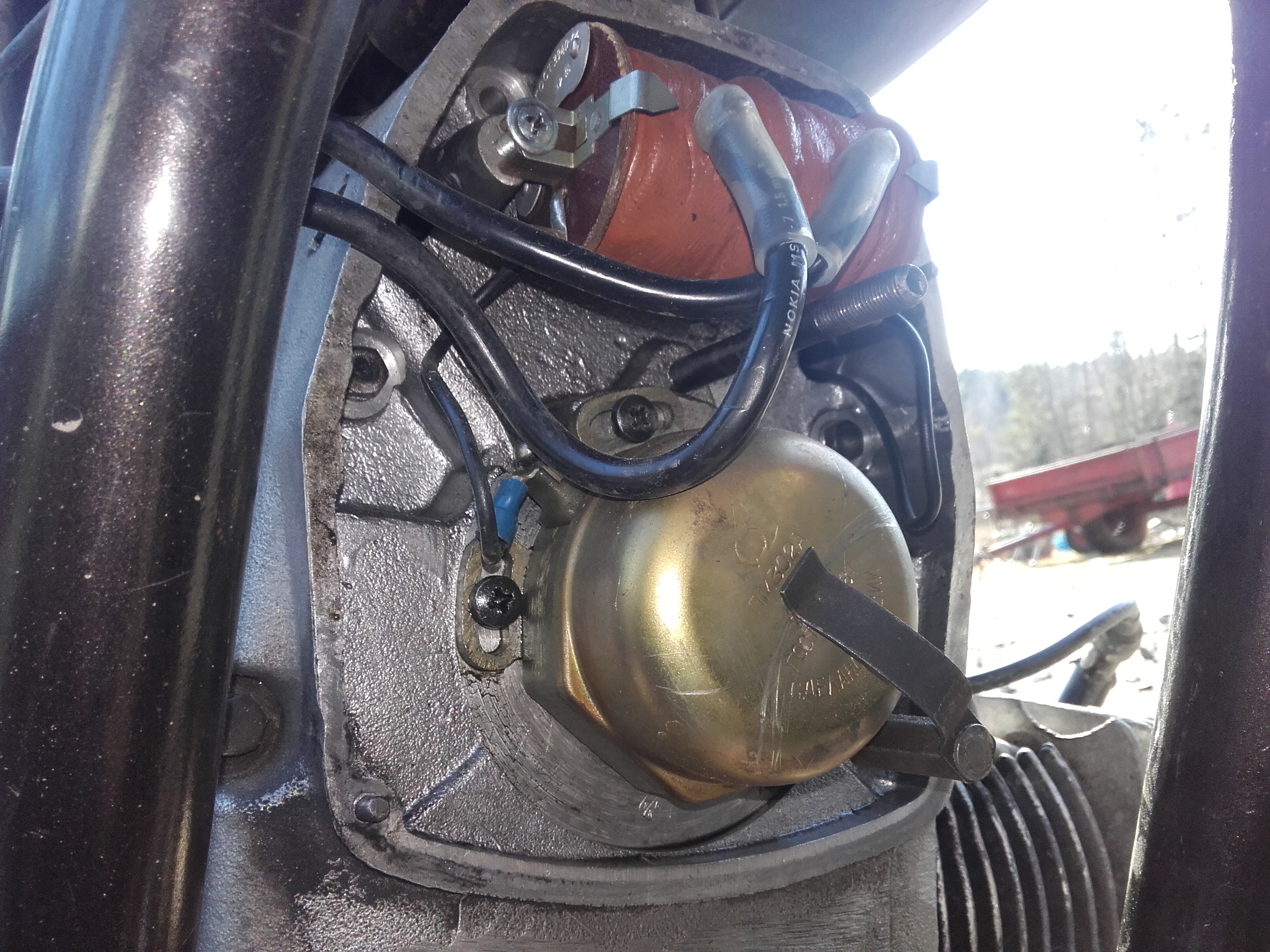 Nopeusmittarin otin pois ja totesin että vaijeri ei ole siellä päinkään. Koitin porakoneella toimiiko mittari, kun ajossa se ei ole toiminut. Akkuporakone kulkee 80km/h. Mittari siis kunnossa. Vaijeri paikoilleen ja oitis testailemaan mittaria ajossa. JUHUU! Toimii! Tosin heiluriliike on melkoista. Onkohan se ihan tyyppivika vai pitääkö availla mittaria ja kiristellä jousta? Nopeuden voi ilmoittaa suunnilleen että "40-70km/h". Tuon heiluriliikkeen keskikohdille taitaa todellinen nopeus palttiarallaa asettua.