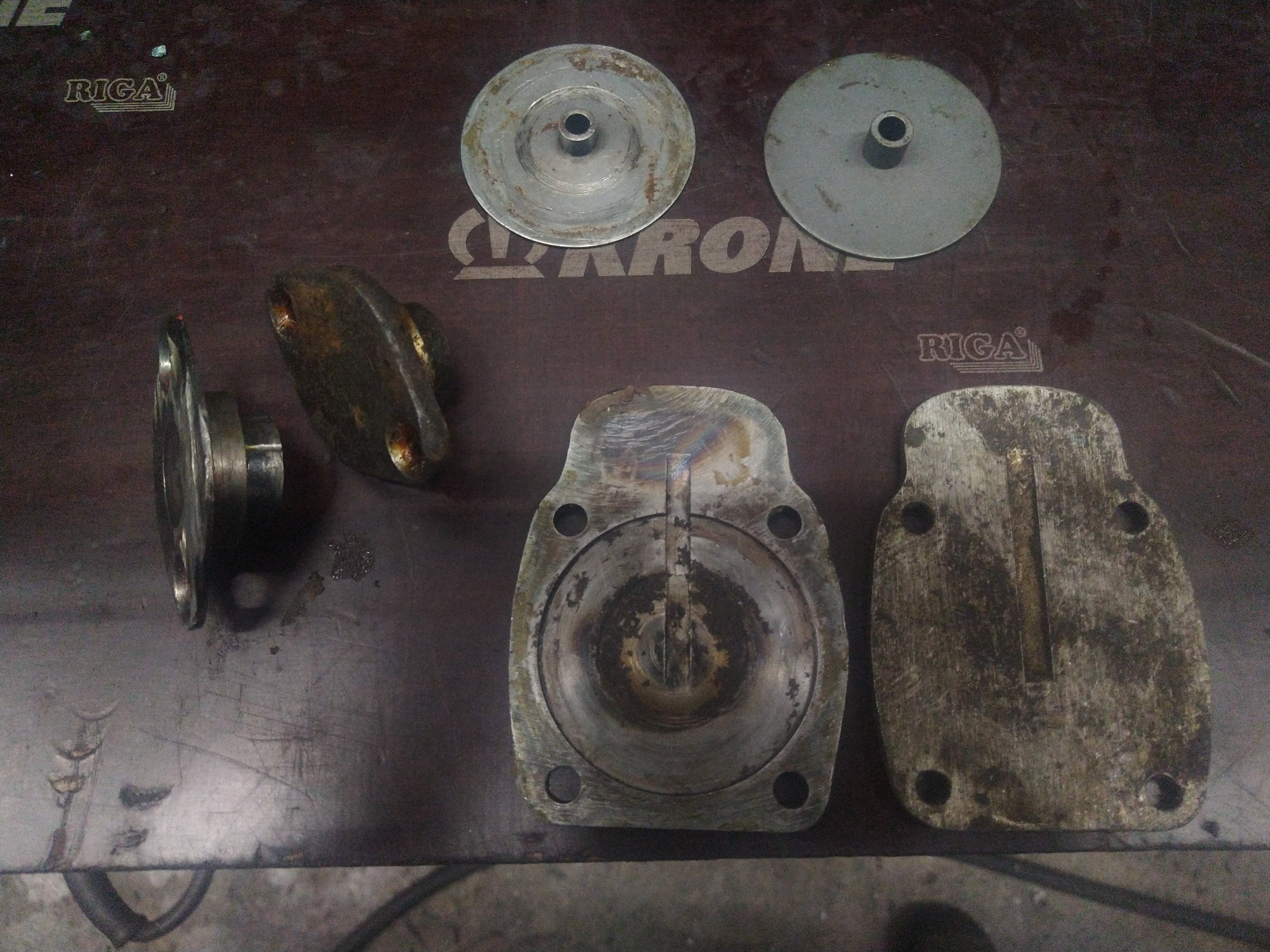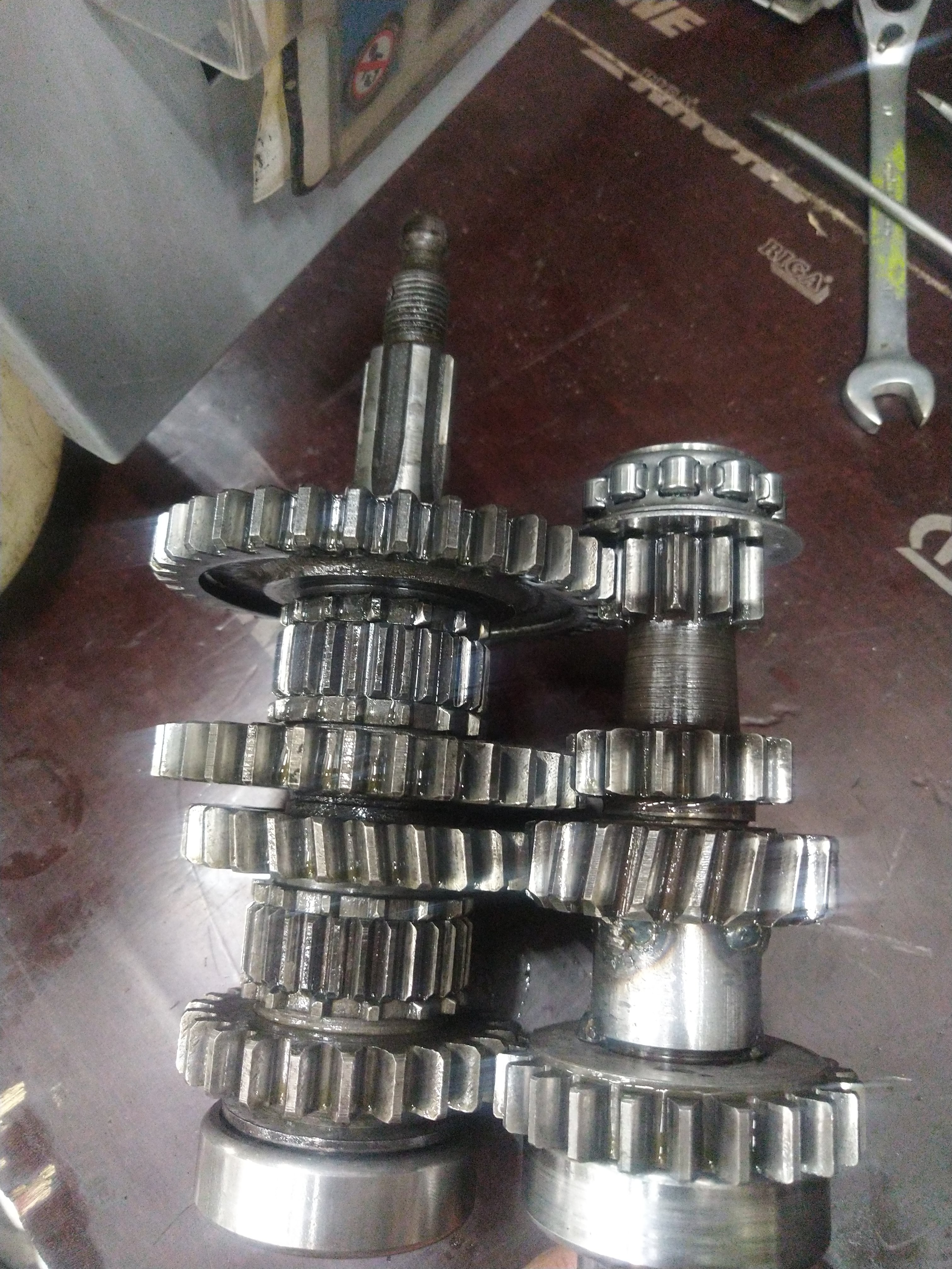 Mitäs näissä on kompastuskivinä? Kiksin räikän lipareen tsekkasin, sen on joku jo kerran kääntäny ja oli ookoo. Simmejä oli käytetty ja oli aika hyvän tuntuset päittäisvälykset. No toisioakselin takalaakerin sisäkooli pyörii akselin ympärillä, ja samaisen akselin etulaakerin kansi aika hurjassa kunnossa.. samoin kuin esim. Kiksin jousen kiristinpala.