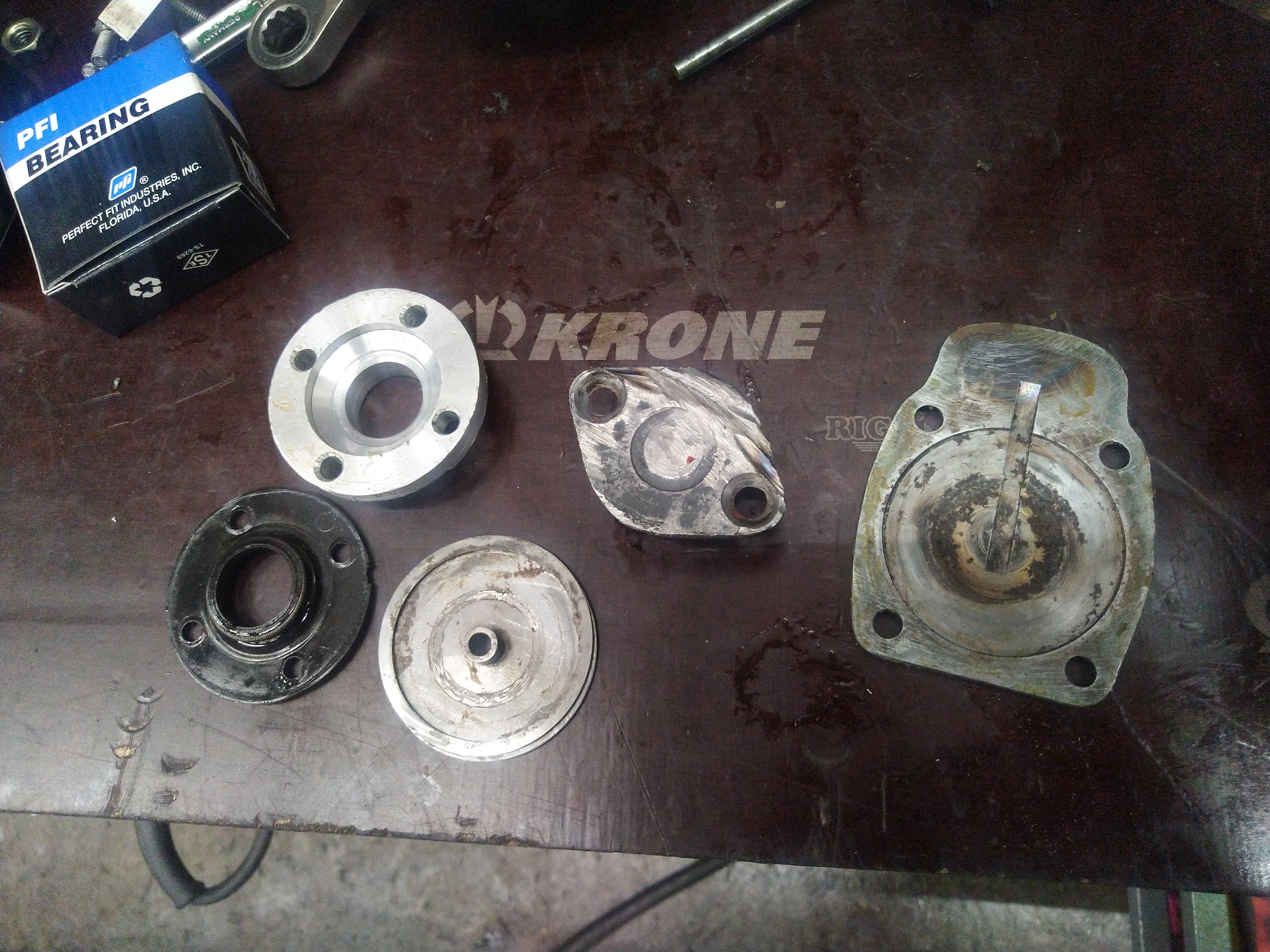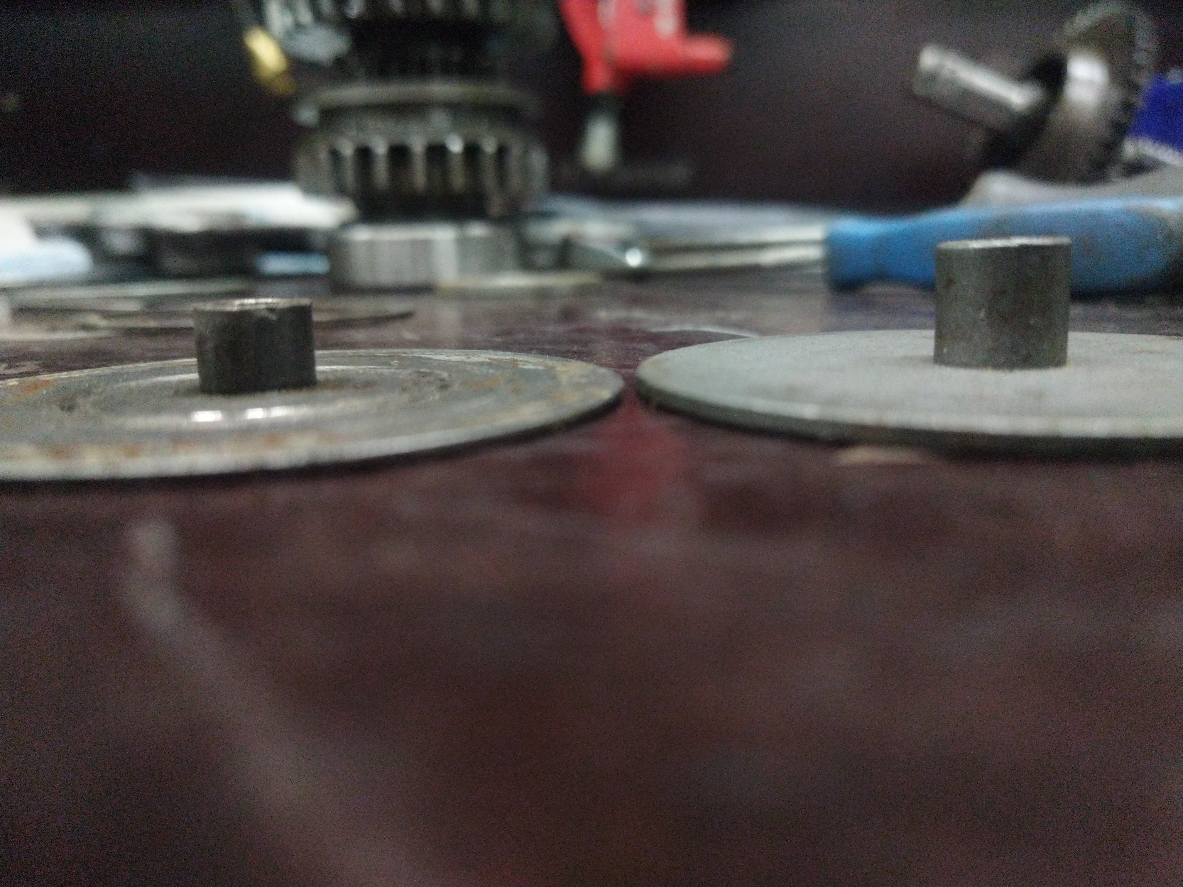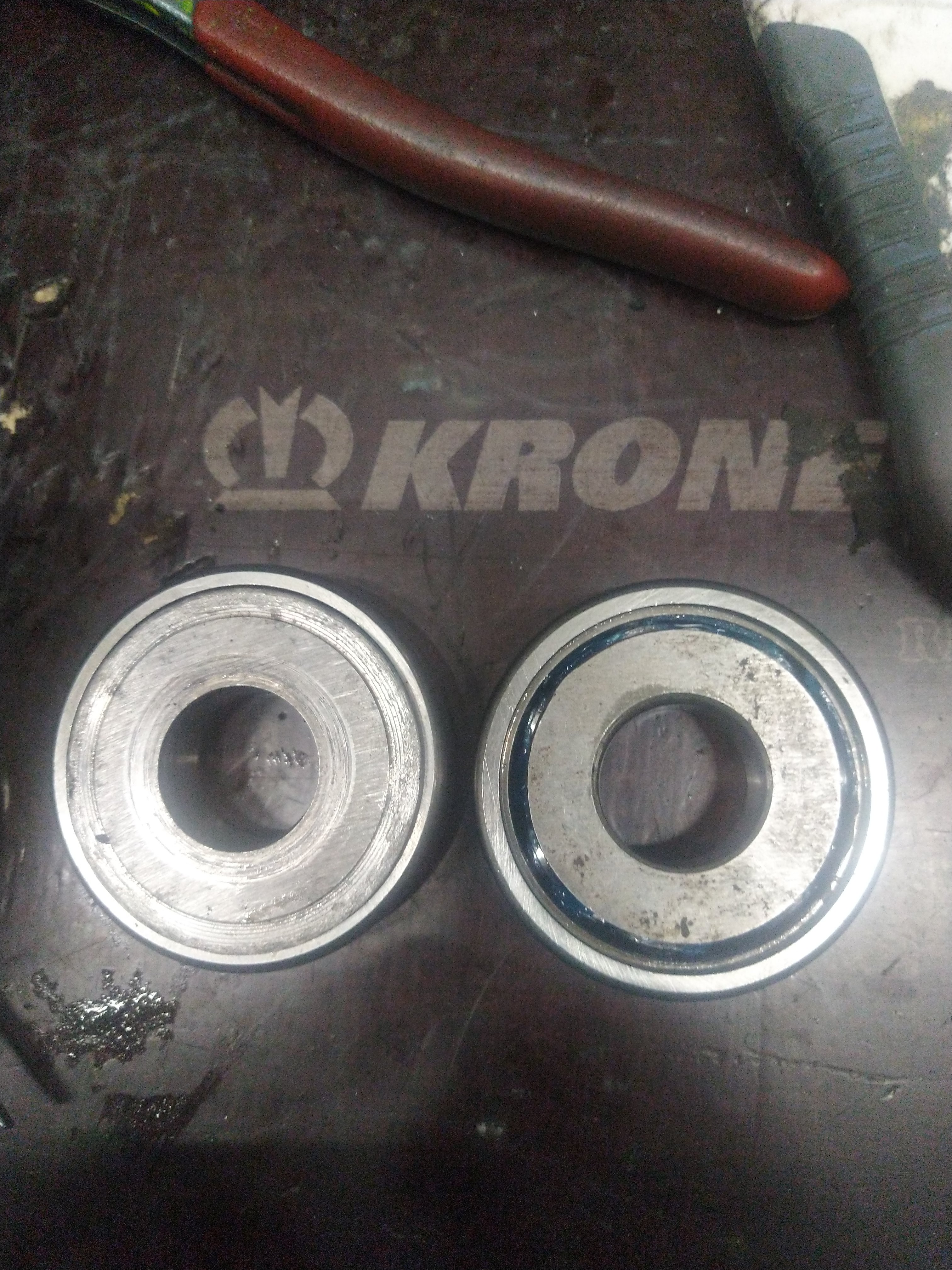 Laakerin ja rattaan väliin sijoittuvista aluslevyistä kumpikohan on oikeampi? Vasemmanlaiset oli paikallaan, hieman erikoisesti kulunut ja varmaan osaltaan päästänyt sitä hienoa silpettä öljyn sekaan jota hieman oli havaittavissa. Oikeanpuoleinen tuli easthighwaylta kun varuiksi tilasin, ei ottaisi laakerin ulkokooliin kiinni ja on 0.05mm pläskimpi