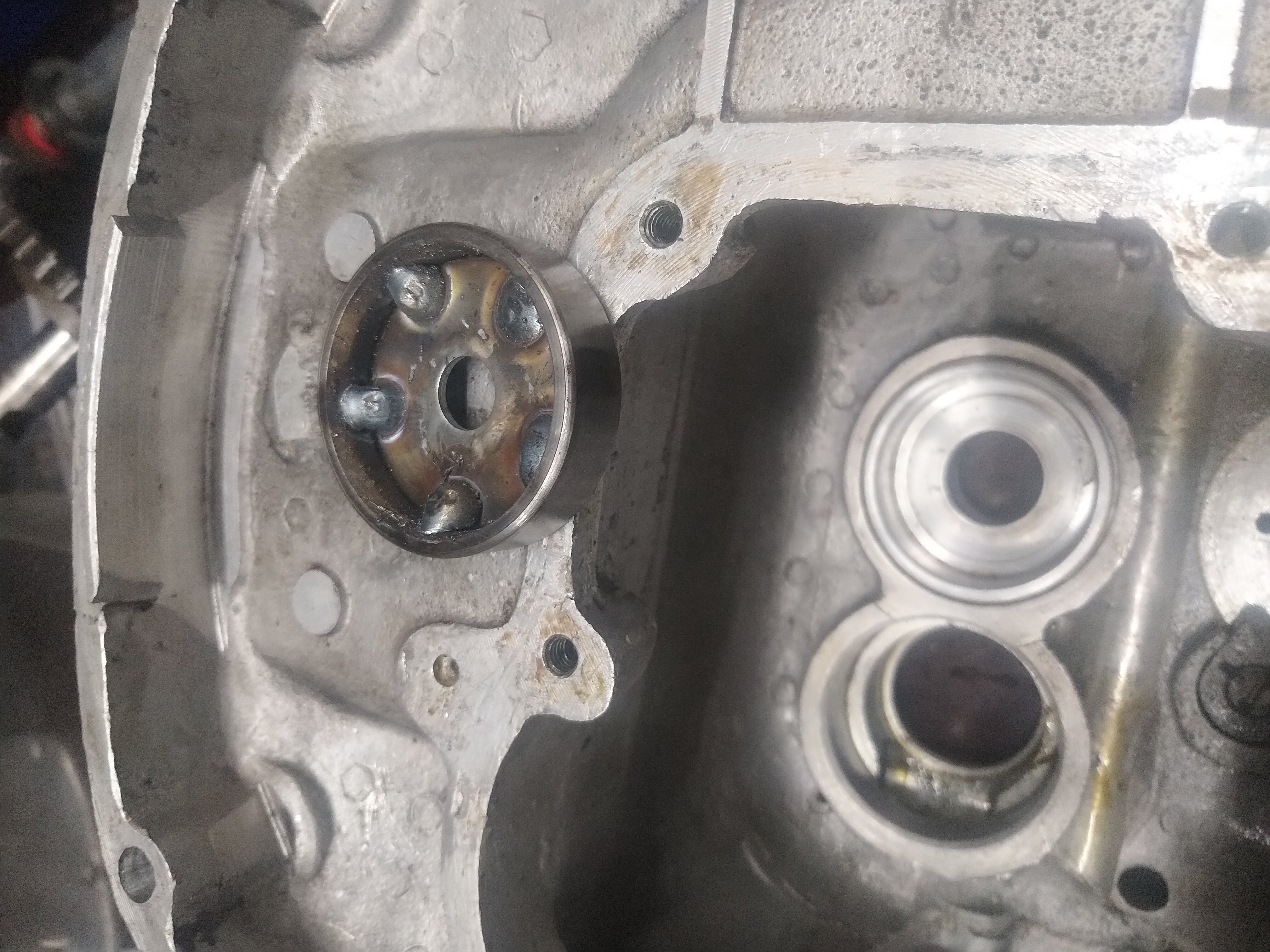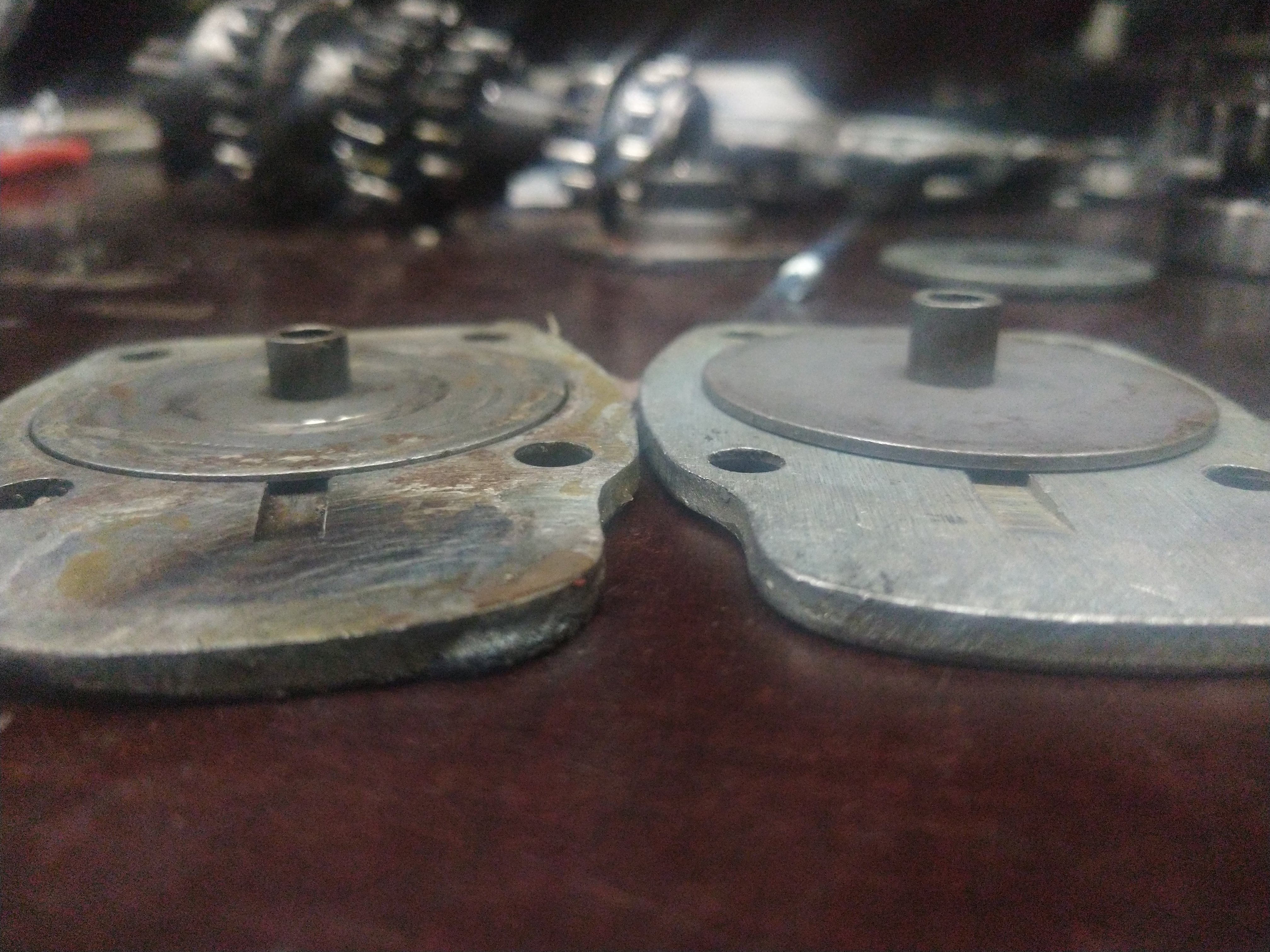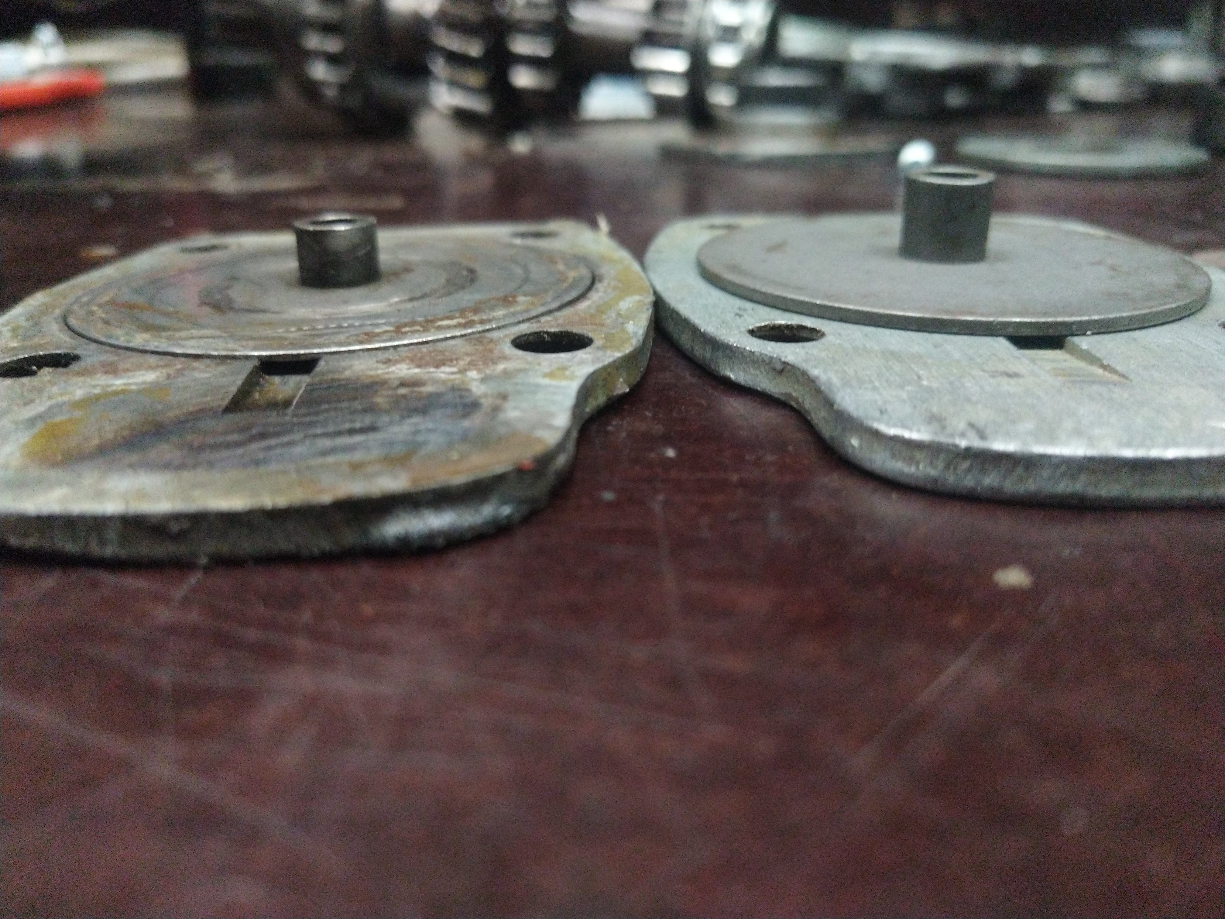 Laakerin ja rattaan väliin sijoittuvista aluslevyistä kumpikohan on oikeampi? Vasemmanlaiset oli paikallaan, hieman erikoisesti kulunut ja varmaan osaltaan päästänyt sitä hienoa silpettä öljyn sekaan jota hieman oli havaittavissa. Oikeanpuoleinen tuli easthighwaylta kun varuiksi tilasin, ei ottaisi laakerin ulkokooliin kiinni ja on 0.05mm pläskimpi