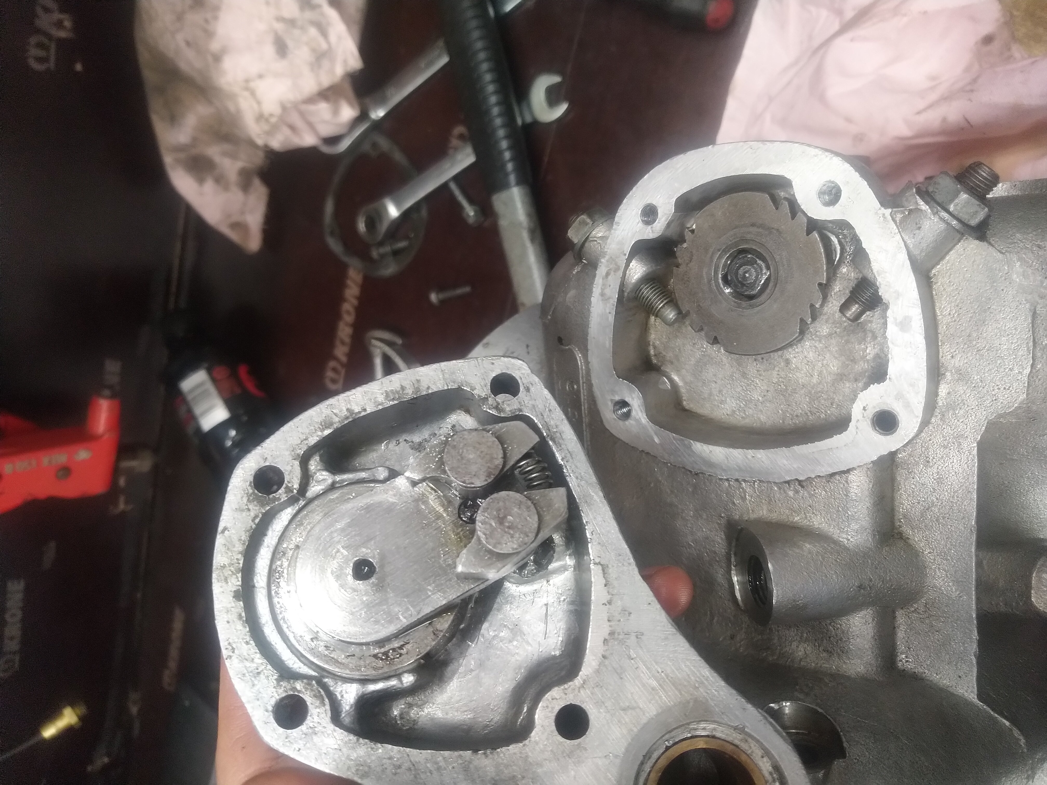 Tuo kantta vasten oleva levy jossa pieni tökö toisioakselin sisään kaiketi öljyn kulkua varten.. uus on korkeempi, sekä pitempi tökö. Meinaako vaan että tarviaa vähemmän simmiä väliin vai onks tääki joku kiinanveljen jekku 🤔